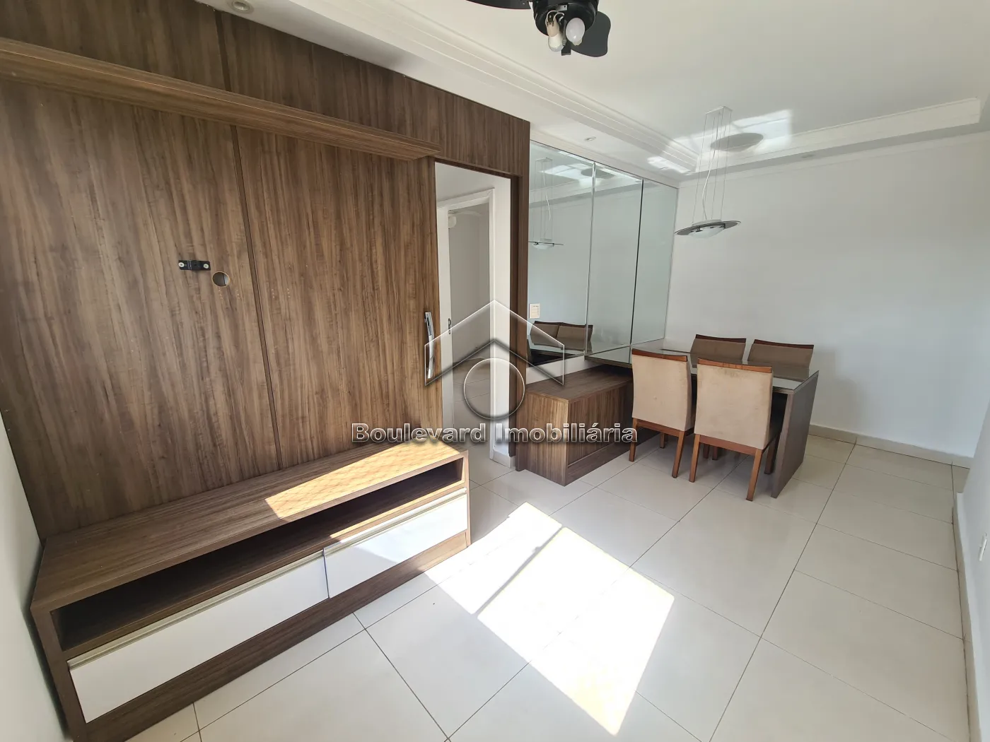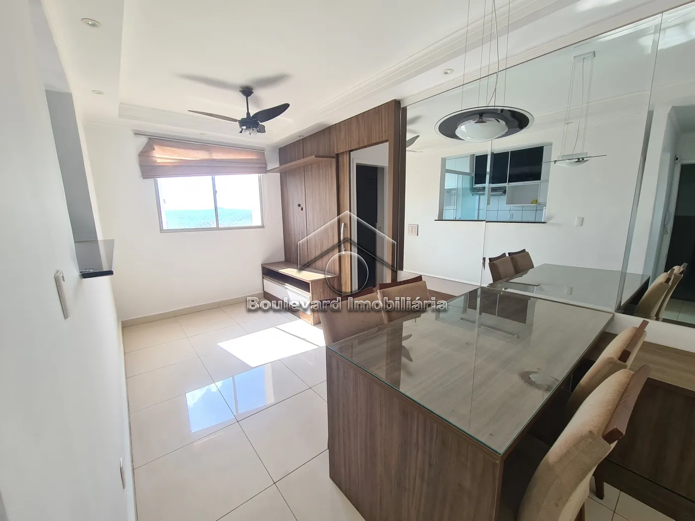 - Sala 02 ambientes com, ventilador de teto, persiana de rolo, espelho, painel de Tv e mesa para 04 pessoas;