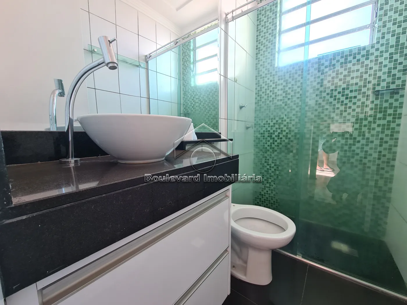 - Banheiro social com, iluminação natural, gabinete, espelho e box blindex;