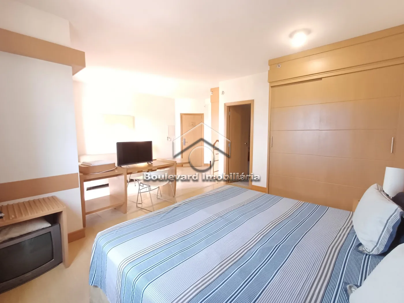 - 01 Suíte com cama box Queen, televisão, armário e mesa de cabeceira;