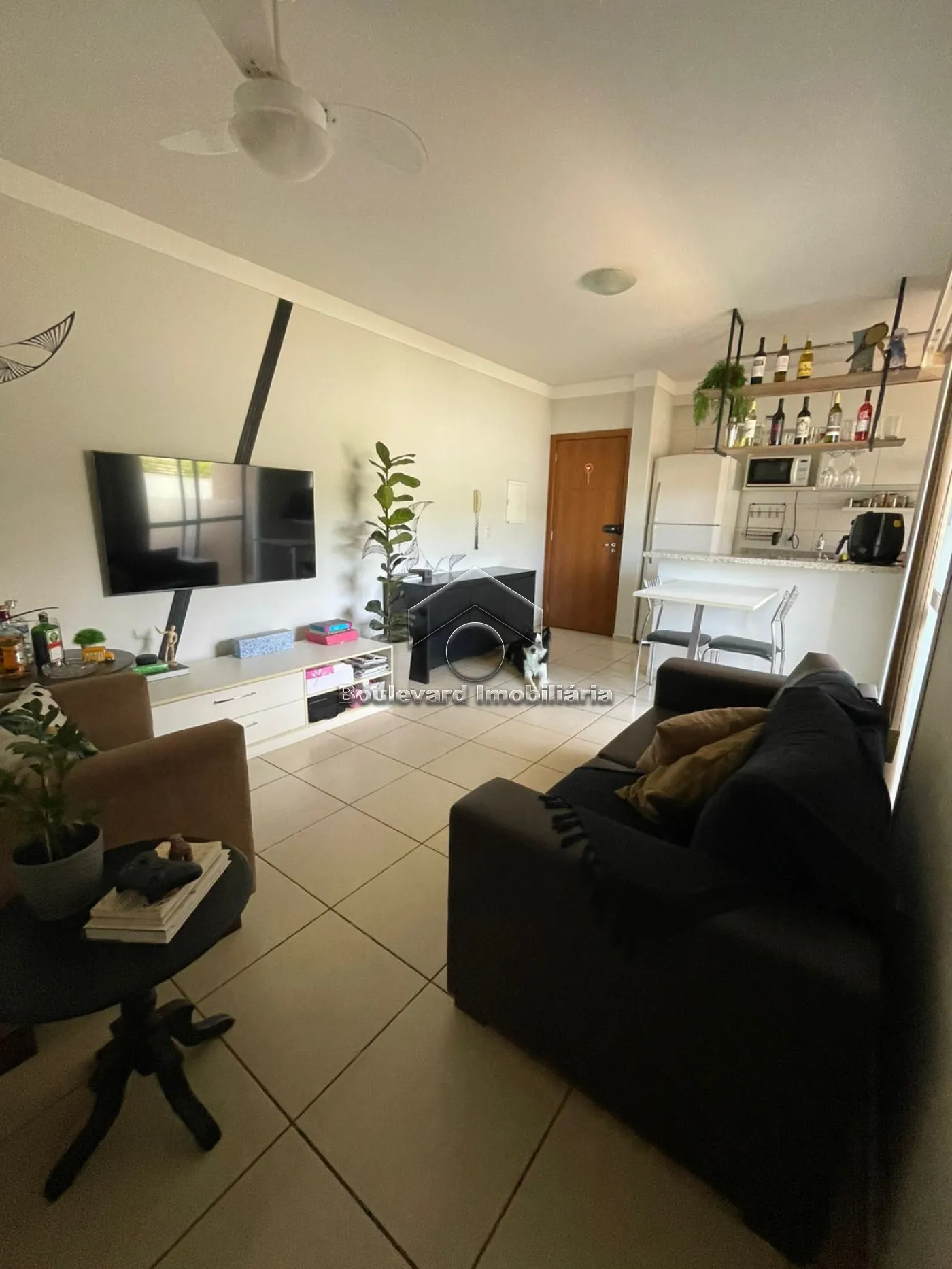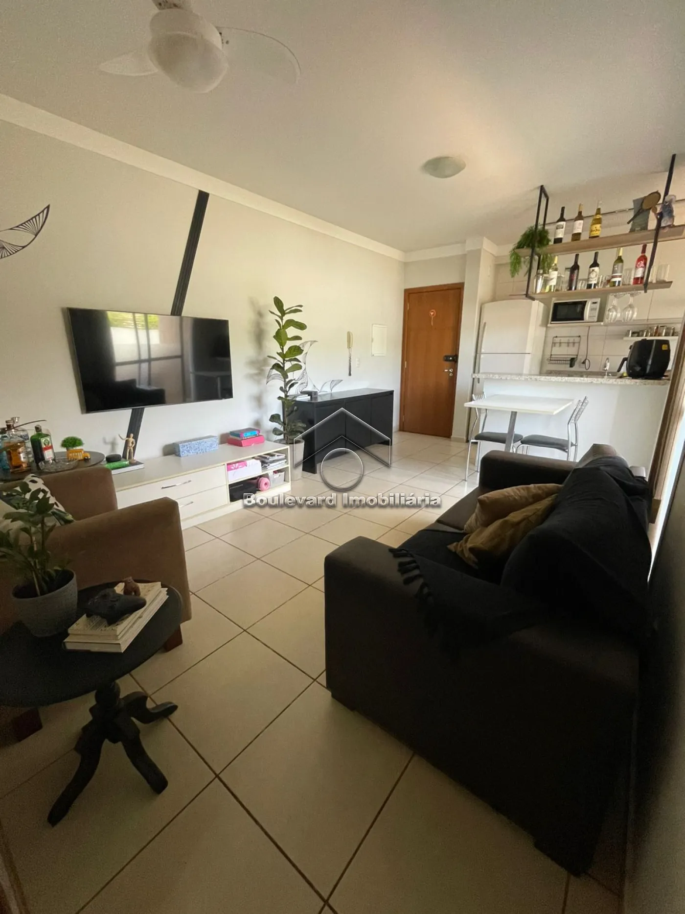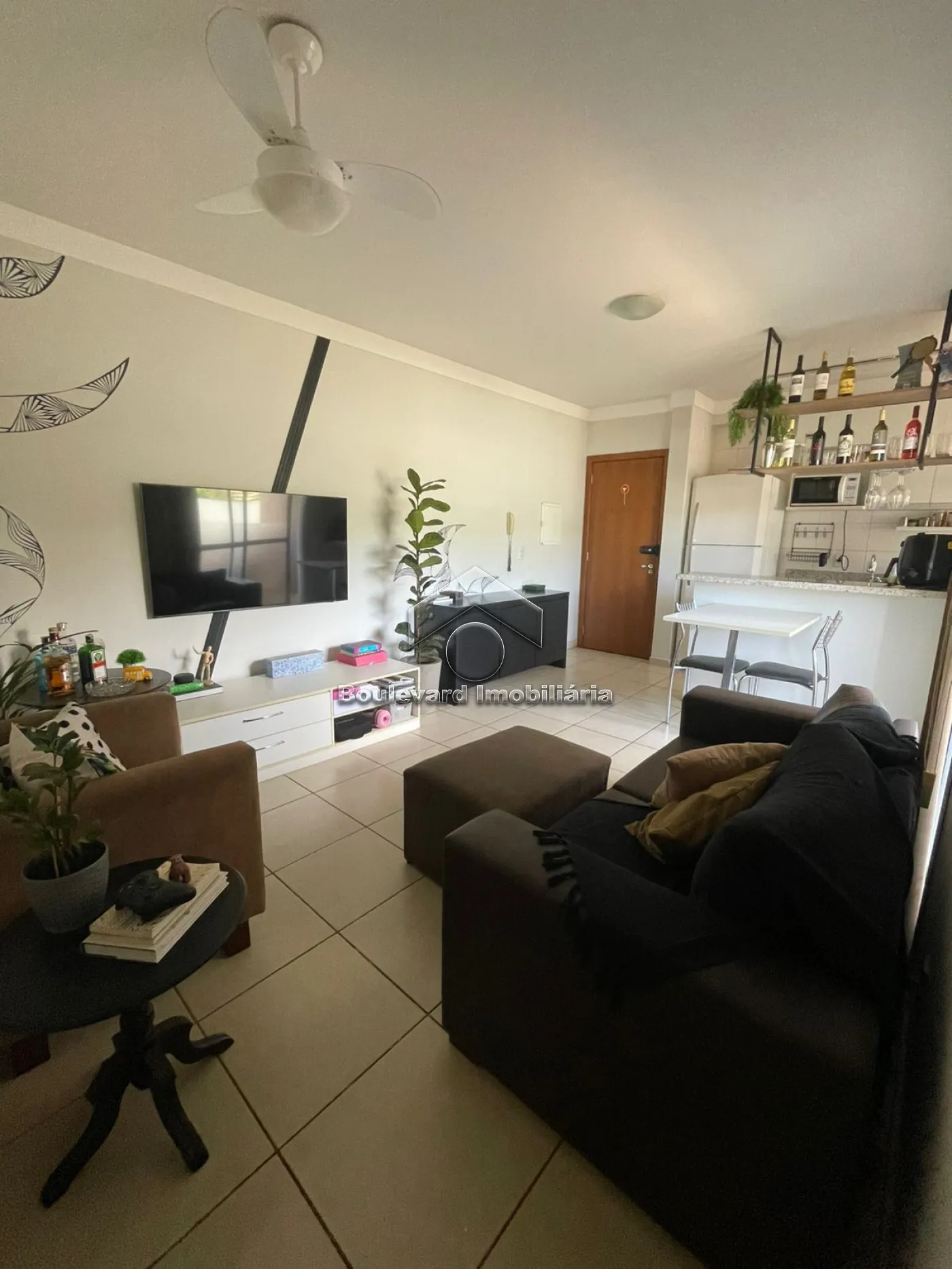 - Sala integrada à cozinha, com rack e ventilador de teto;