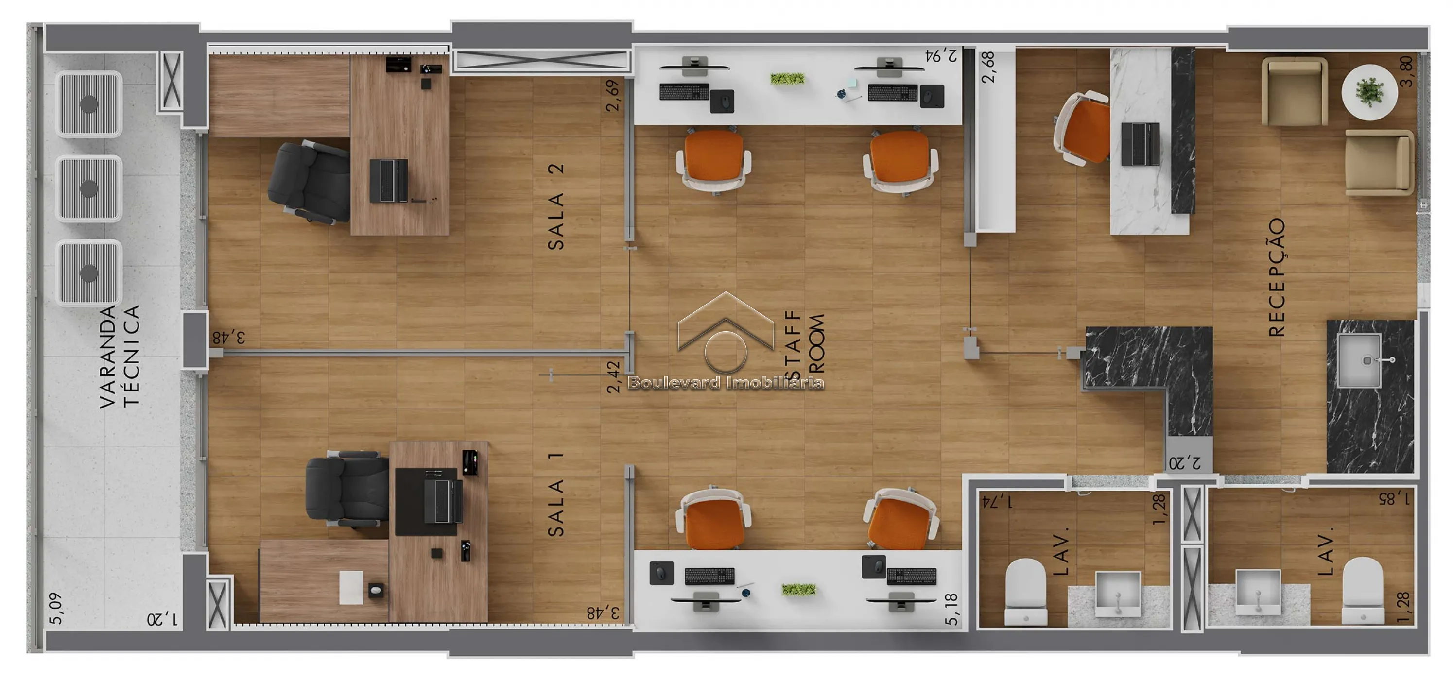 - Ambiente versátil, ideal para personalização conforme o tipo de negócio;