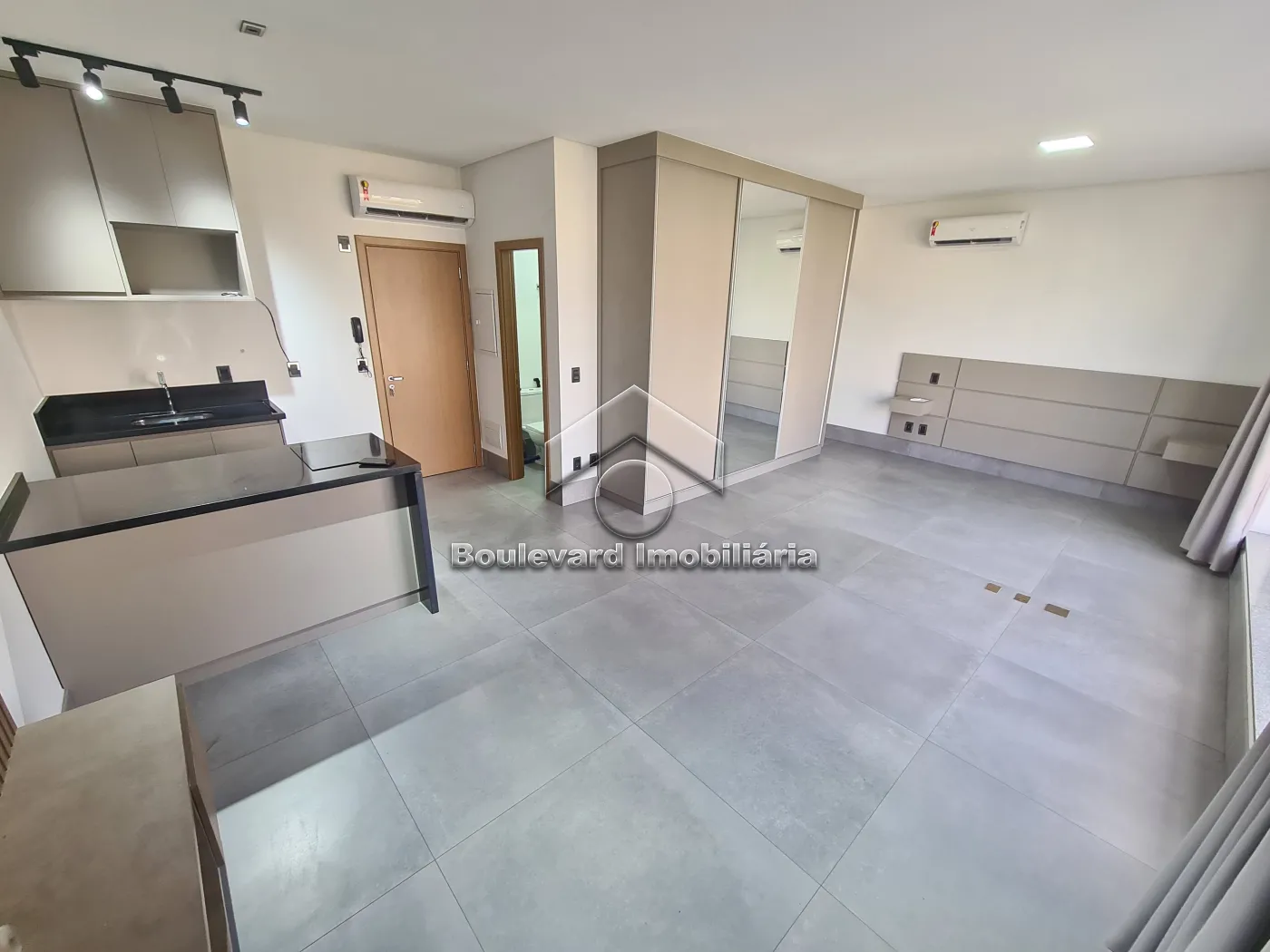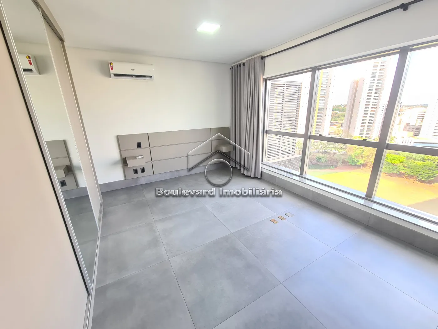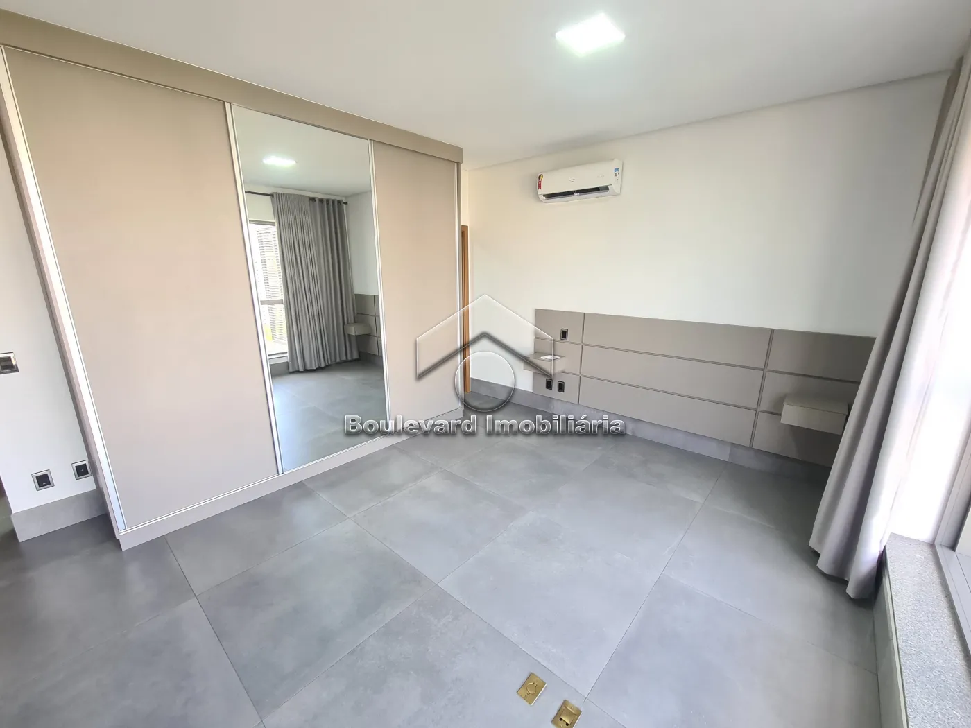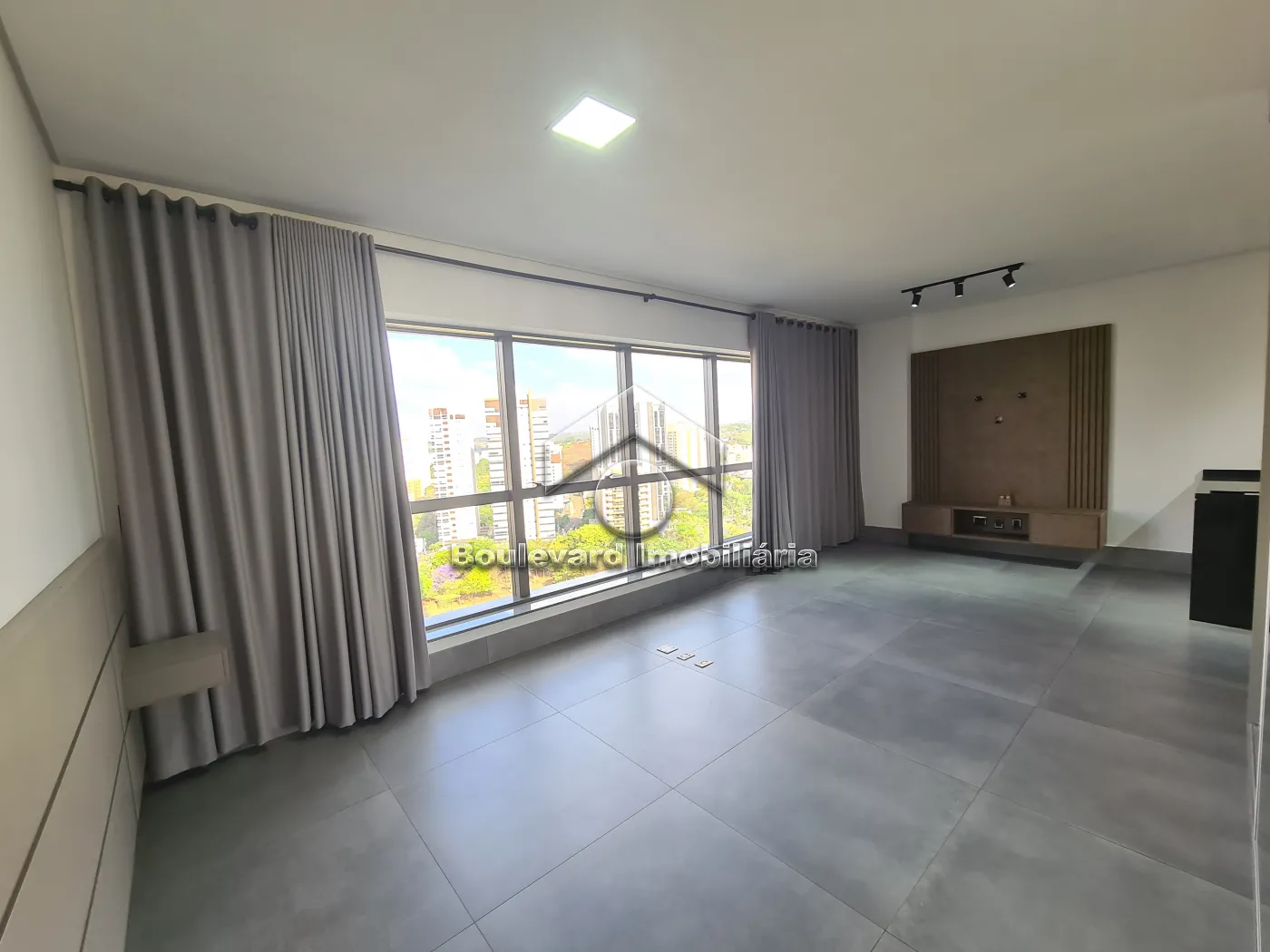 - Sala com painel de TV, ar condicionado e cortinas instaladas;