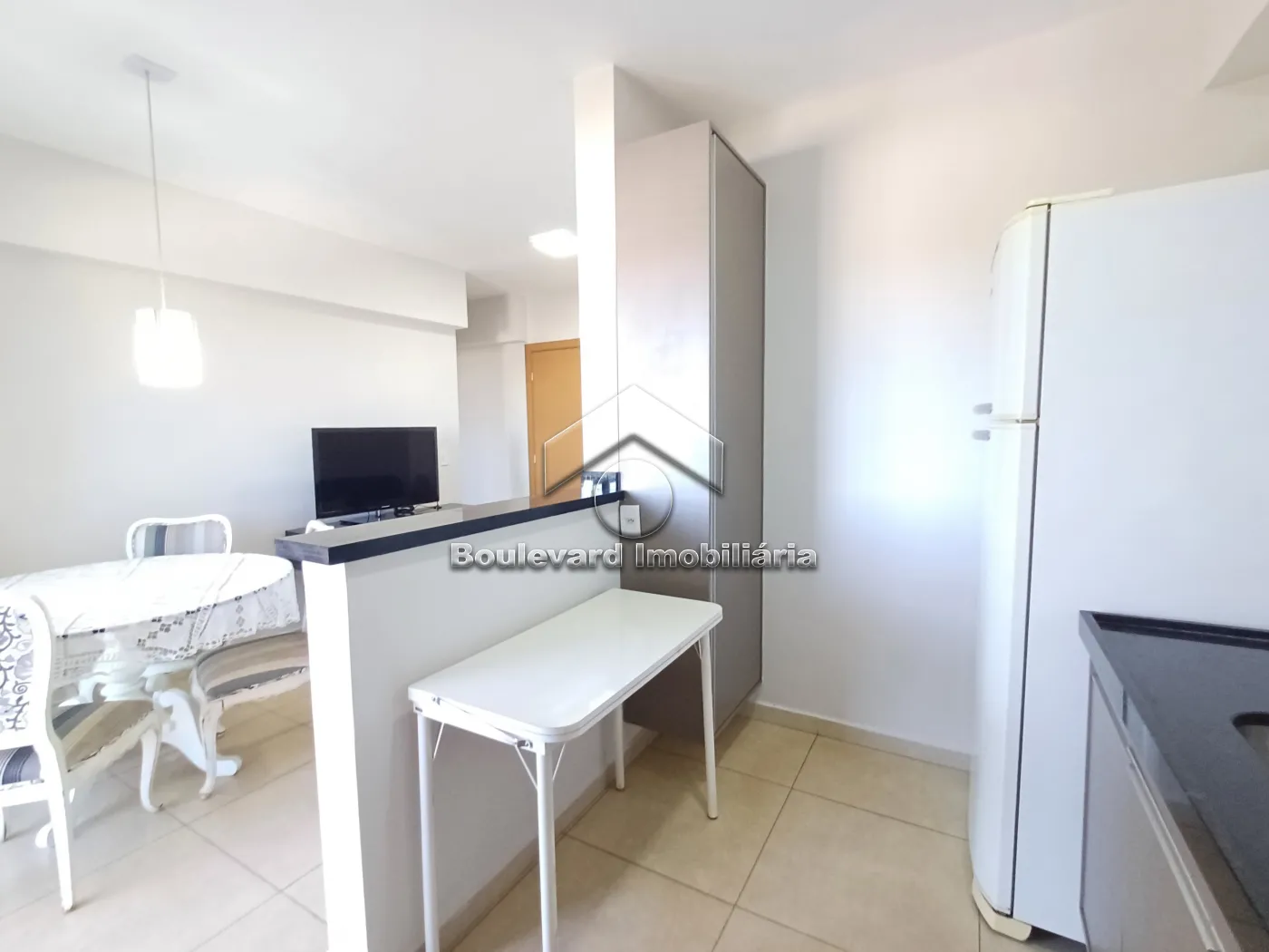 - Sala 02 ambientes com sofá, televisão e mesa com cadeiras;