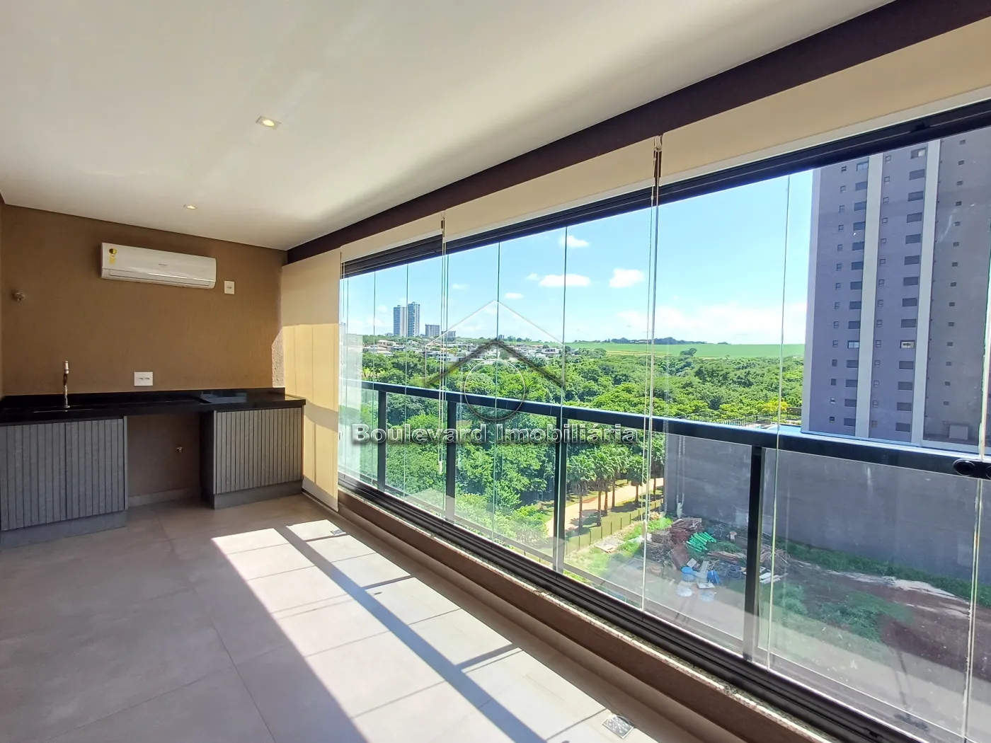 - Varanda gourmet fechada com blindex, persianas, armários e ar-condicionado, ideal para momentos de lazer e confraternização;