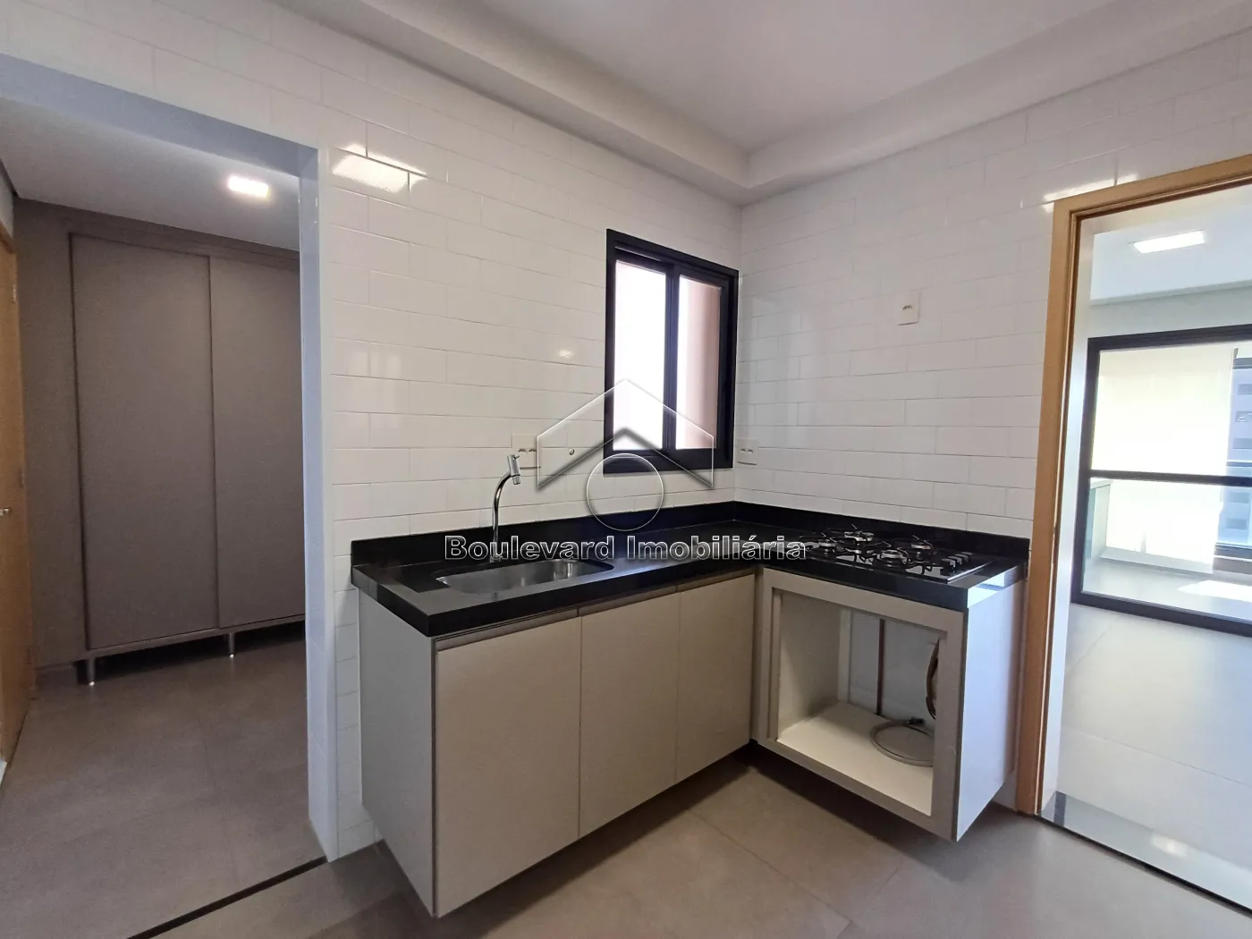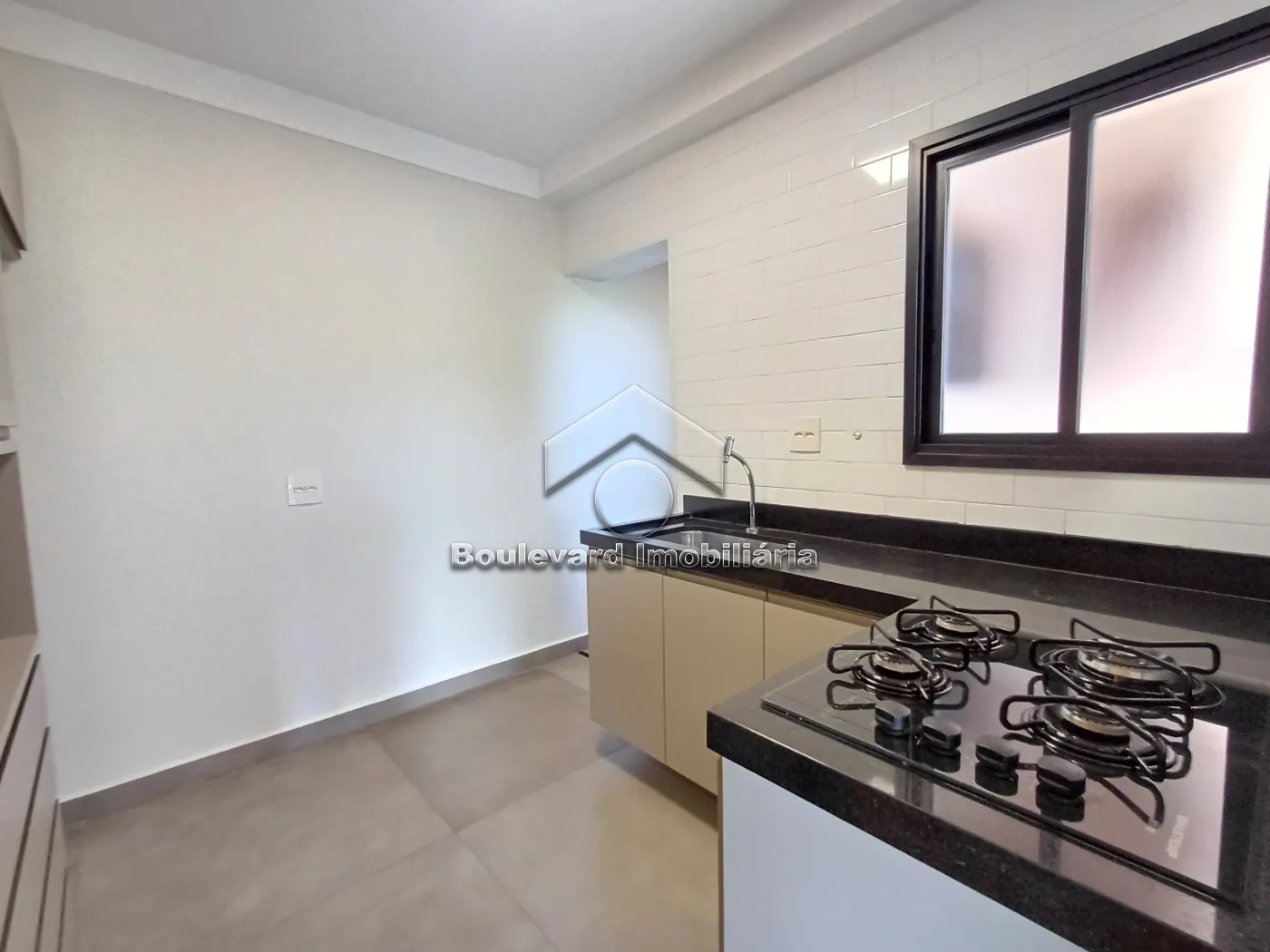 - Cozinha planejada com armários e cooktop;